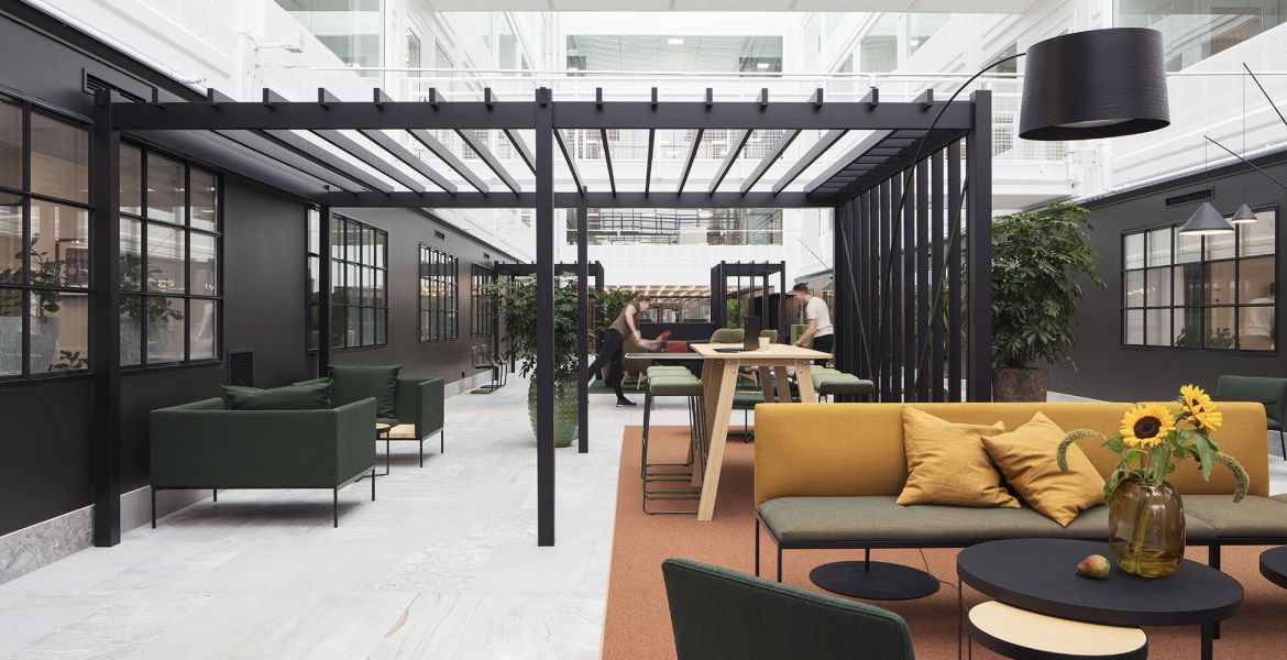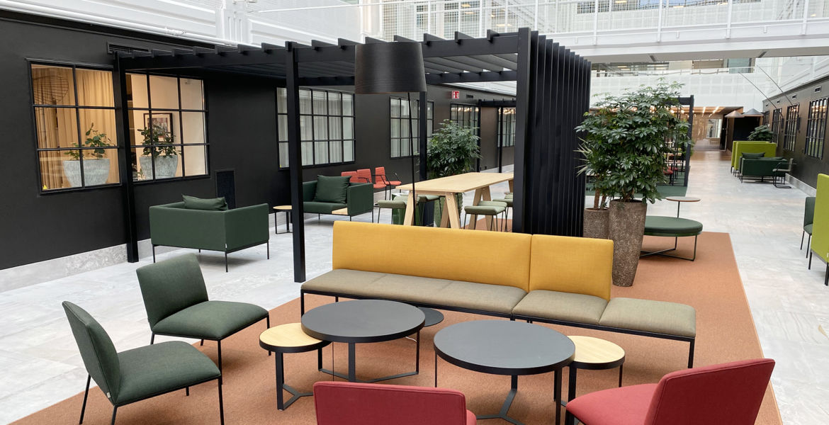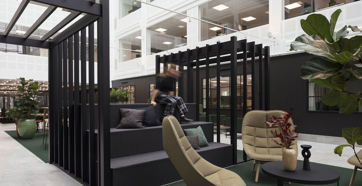 När man kommer in i byggnaden, i ljusgården, så är det en total omvandling. De två ljusgårdarna som tidigare saknade koppling med varandra sammanlänkas nu genom en passage. Ljusgårdarnas tidigare växthusformade glastak har ersatts med modernt utformade glassystem som skapar maximalt med ljus och rymd. Fokus har varit att ta vara på den rymd som finns men samtidigt göra det här stora rummet lite mindre. Tanken har varit att förstärka de fysiska förutsättningarna, dramaturgin som egentligen redan fanns där men var dold. Niklas förklarar vidare att tanken varit att hålla en småskalig nivå just på vistelseytan med mörka fondväggar, möblera upp och fylla den så att den upplevs varierad, trygg, varm och ombonad och på så sätt skapa en kontrast till den luftiga lättheten som växer uppåt.