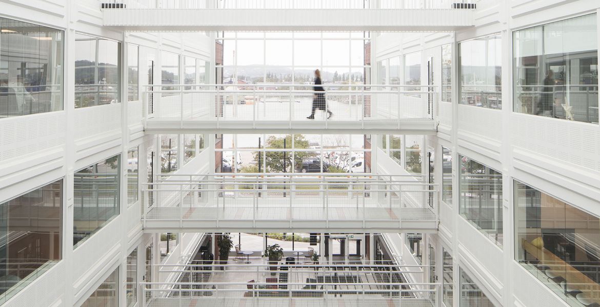 Lea menar att förhoppningen är att de båda ljusgårdarna, som är tänkta att ses som en helhet och som har lite olika färgskalor och identitet ska användas så mycket som möjligt. I och med de stora glasade partierna på varje våningsplan blir kontakten ner mot ljusgårdarna också stor. Niklas förklarar vidare att tanken varit att skapa en kontakt, dels mellan det egna kontorets olika delar som i vissa fall avskiljs med lite luft men samtidigt sitter ihop med gångbroar, och dels mellan andra företag.