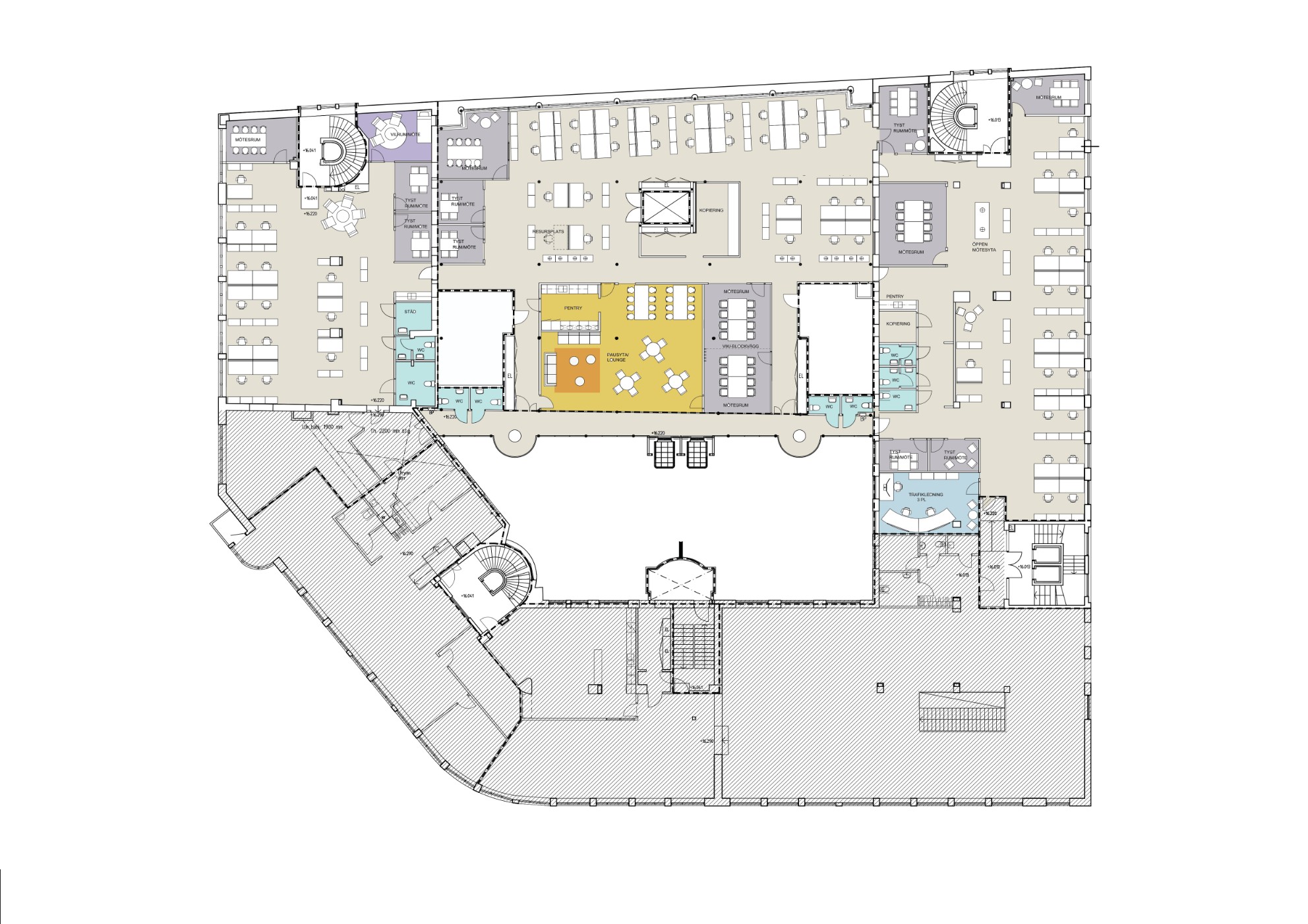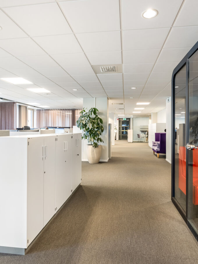 Planlösningen är flexibel och genomtänkt, med öppna kontorslandskap, enskilda arbetsrum, fokusrum och flera konferensrum. Ett rymligt och inbjudande lunchrum blir en naturlig samlingspunkt för arbetsdagen.