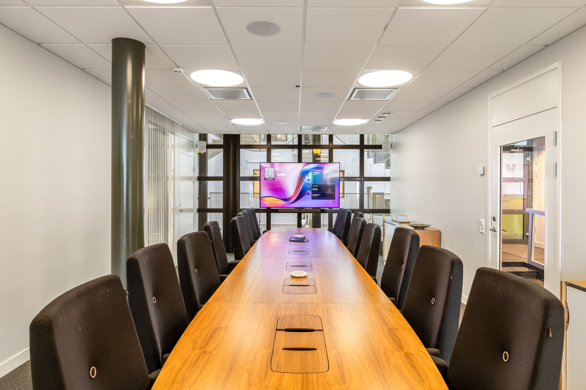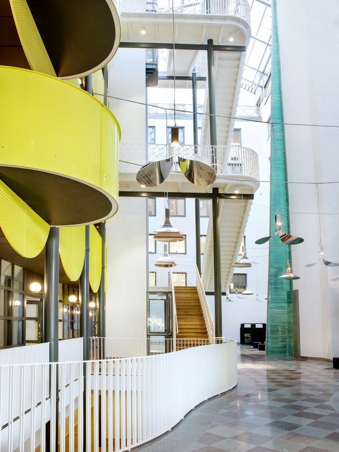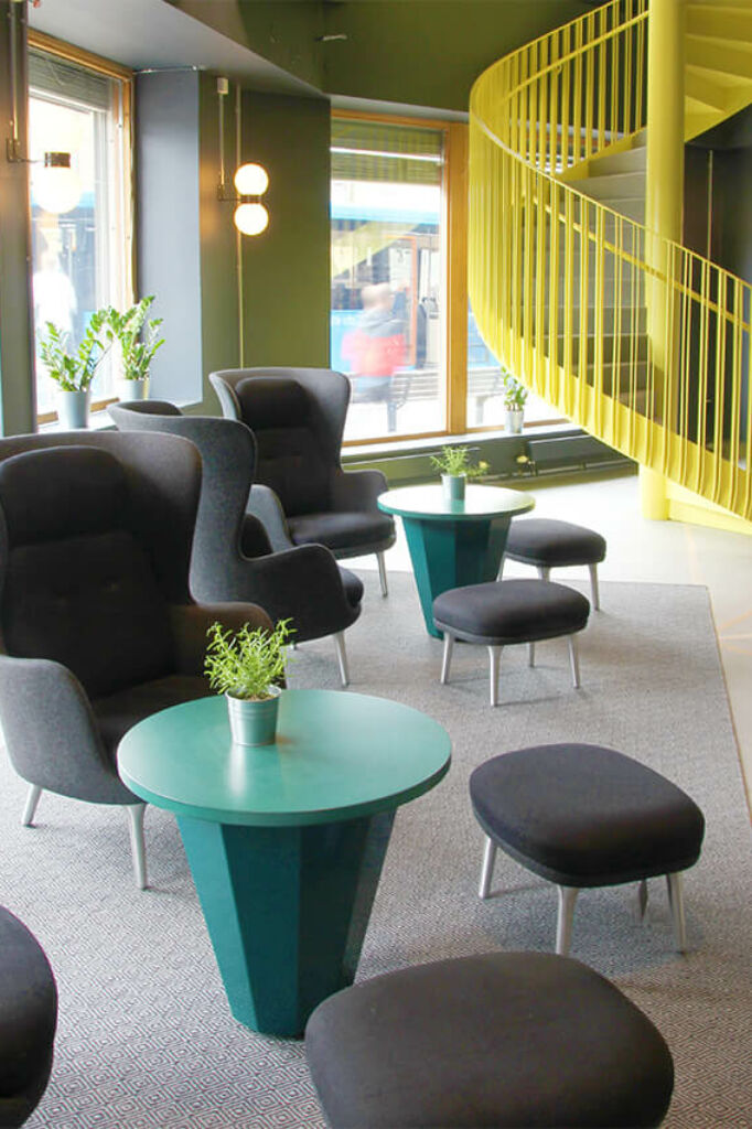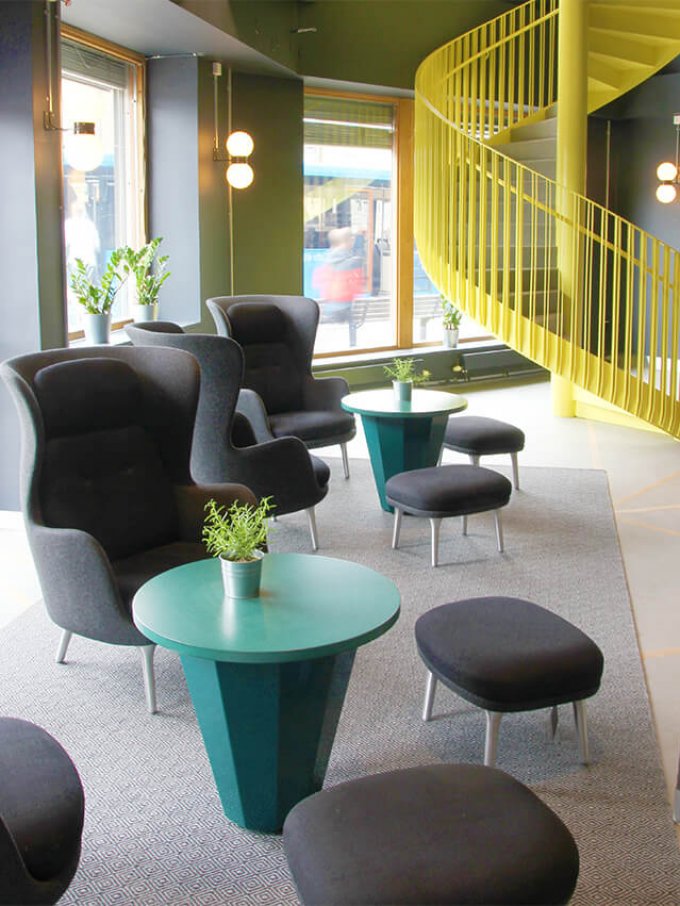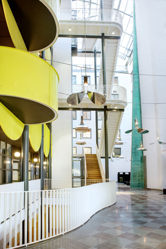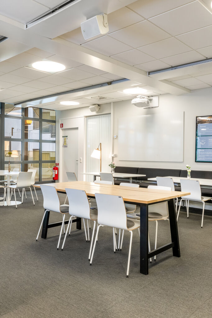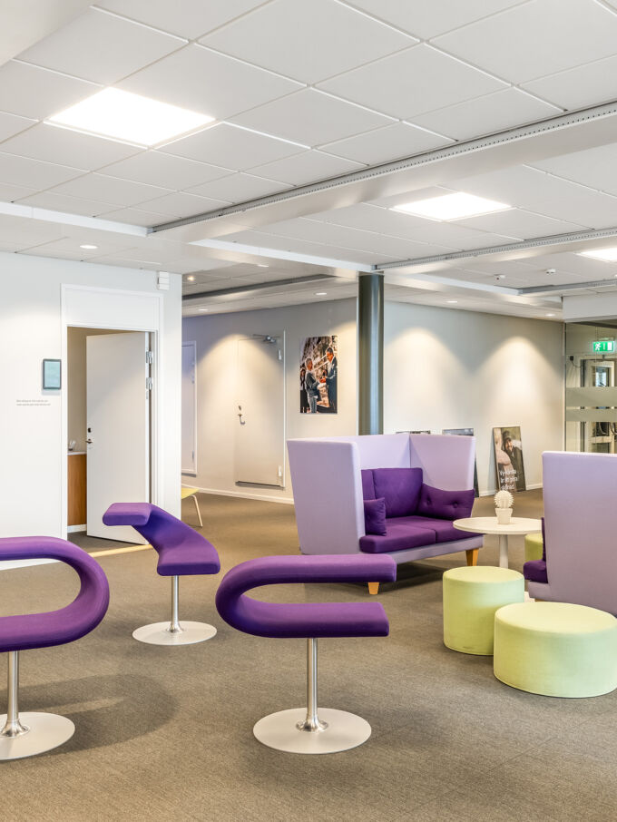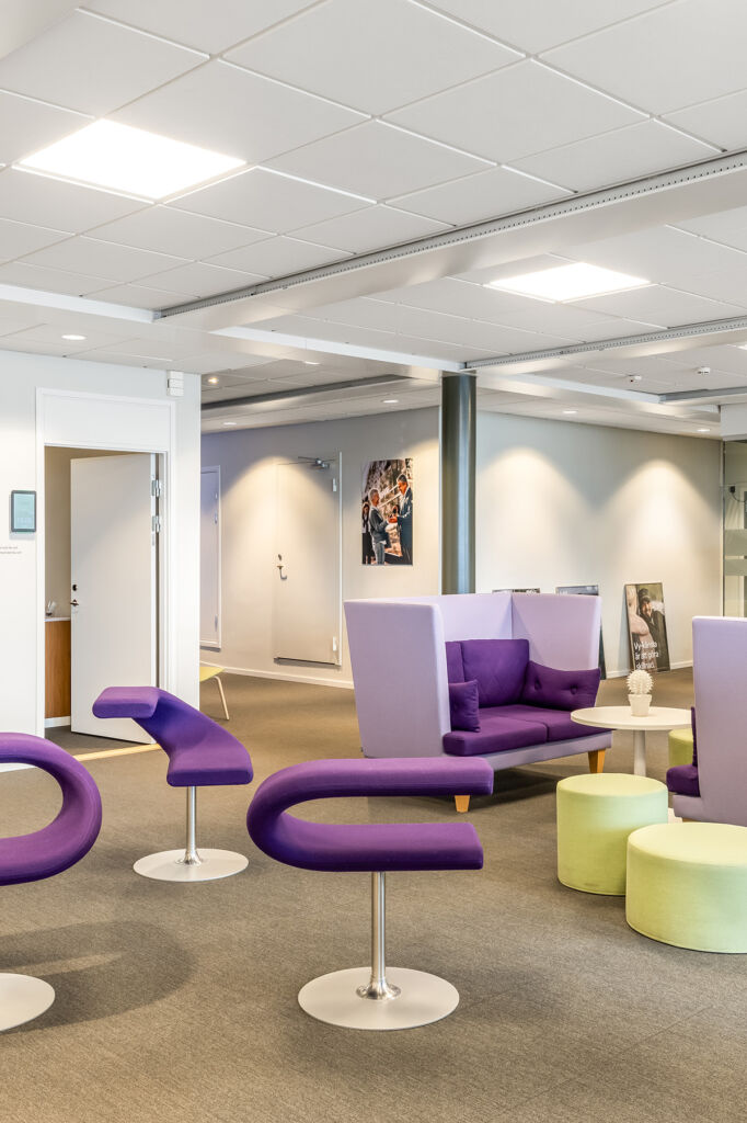 När du kliver in i fastigheten möts du av en elegant entré med en ljusgård som bjuder in både medarbetare och besökare att slå sig ner en stund. Här finns trevliga sittplatser i en miljö som känns både välkomnande och professionell, perfekt för informella möten eller en paus i vardagen. I entréplanet finns även en bemannad reception och tillgång till en modern konferensanläggning, vilket gör det enkelt att ta emot kunder och samarbetspartners på ett representativt sätt.