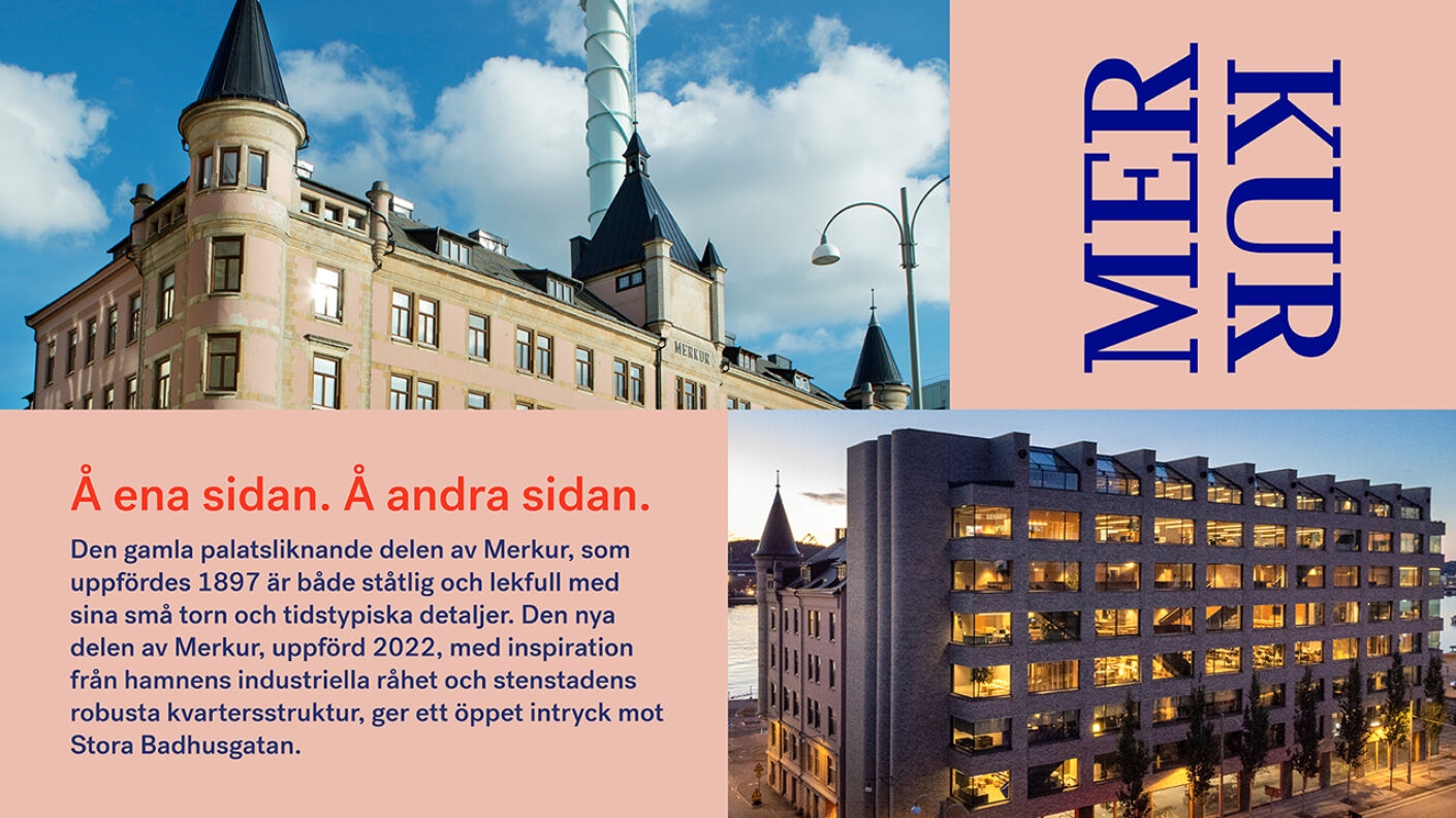 Längst upp i det pampiga Merkurhuset, med utsikt över hamninloppet, hittar du denna trevliga lokal om 361 kvm. Lokalen erbjuder både öppna landskap och aktivitetsbaserade kontorsytor. Lokalen har ett fint ljusinsläpp och fastighetens läge med utsikt över hamninloppet är svårt att tröttna på. Huset är byggt 1897 och är en klenod och det äldsta huset i området med sin vackra rosa fasad och sina pampiga torn. 2022 byggdes huset till med en helt ny del med inspiration från hamnens industriella råhet och stenstadens robusta kvartersstruktur vilket skapar ett öppet intryck mot Stora Badhusgatan. Huset vann dessutom det prestigefulla Kasper Salin-priset för bästa byggnad 2022.